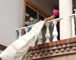 屋内での避難訓練後は、屋外にて避難袋を用いた訓練も実施しました。